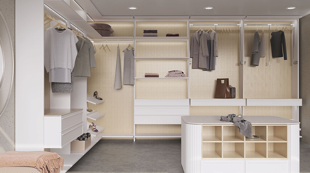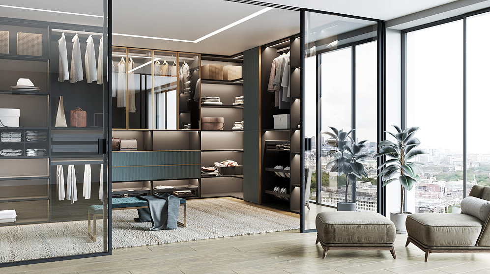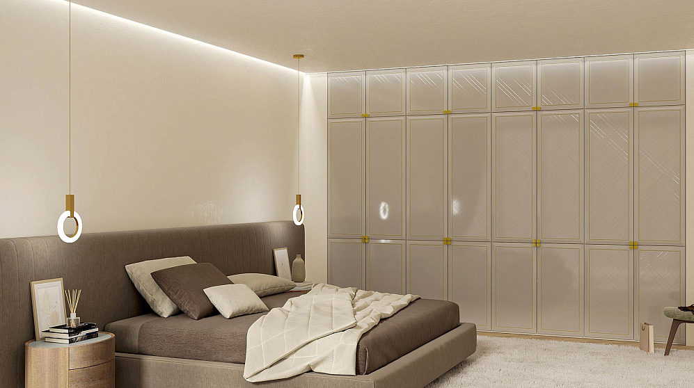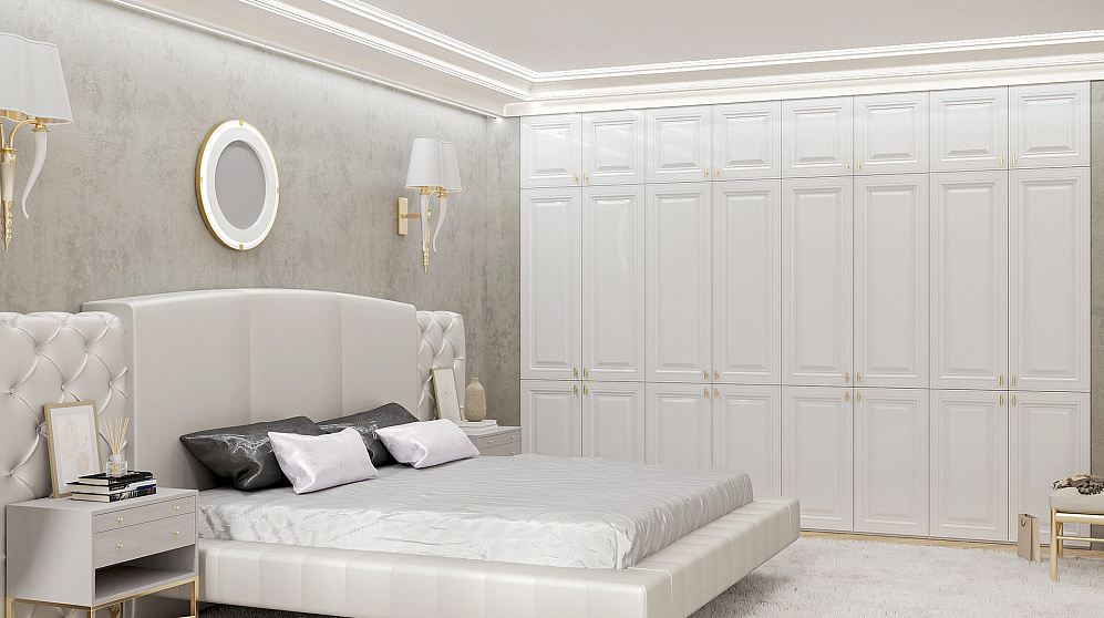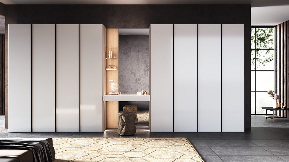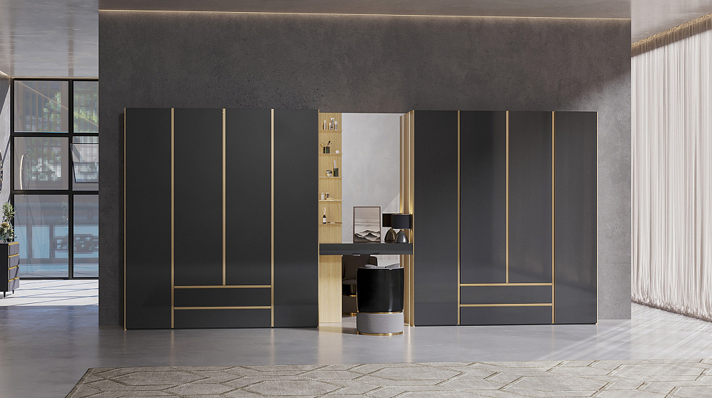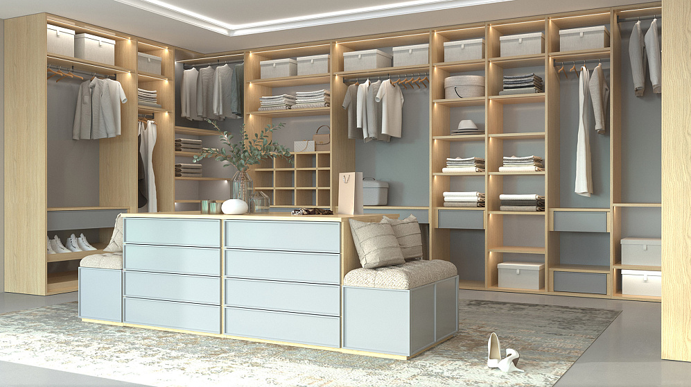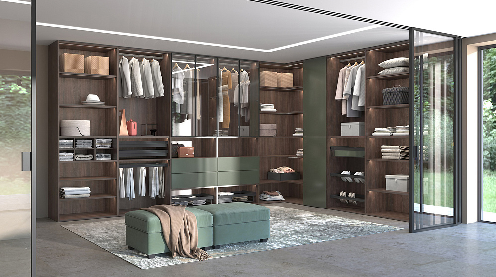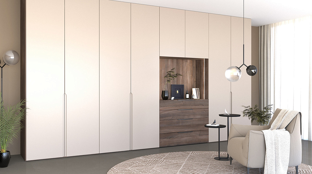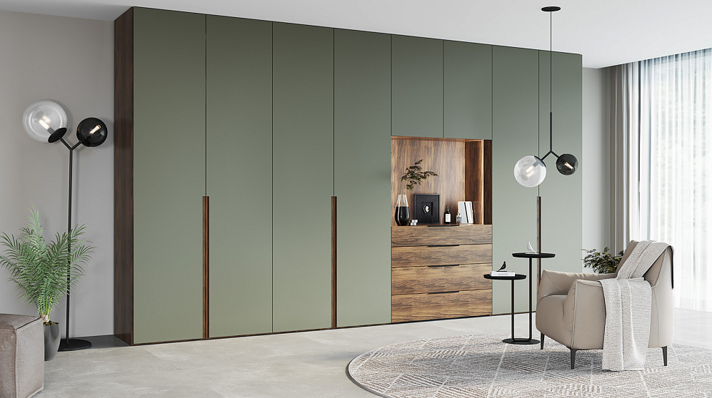 Отличительной особенностью данной модели гардеробной является интегрированная ручка — Нео LONG. Максимум удобства и минимум деталей. Оптимальная высота расположения ручки позволит комфортно пользоваться мебелью, а лаконичный дизайн фасада станет неотъемлемой частью самого изысканного современного интерьера. Корпус выполнен из ЛДСП 25 мм, Noce Reale. Отделка фасадов: МДФ 22мм, покраска в цвет RIMI Eucalipto gloss 25%. Ручка Нео LONG: отделка Noce Reale.