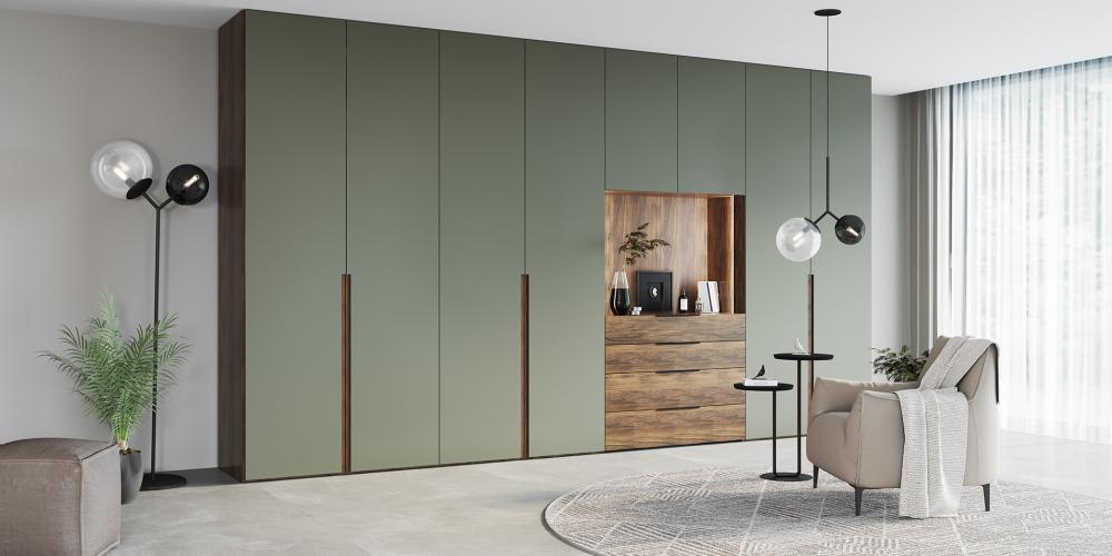 Отличительной особенностью данной модели гардеробной является интегрированная ручка — Нео LONG. Максимум удобства и минимум деталей. Оптимальная высота расположения ручки позволит комфортно пользоваться мебелью, а лаконичный дизайн фасада станет неотъемлемой частью самого изысканного современного интерьера. Корпус выполнен из ЛДСП 25 мм, Noce Reale. Отделка фасадов: МДФ 22мм, покраска в цвет RIMI Eucalipto gloss 25%. Ручка Нео LONG: отделка Noce Reale.