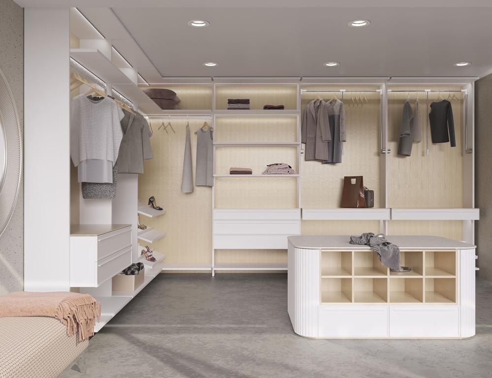 Утонченные линии, ощущение света и воздуха воплотились в композиции с модными фасадами Примавера и Канти. Благодаря уменьшенным боковинам, гардеробная выглядит более легкой, но не менее функциональной. Широкий выбор таких аксессуаров как навесные выдвижные ящики, элегантные полки, органайзер для аксессуаров и одежды позволит оформить гардеробную на Ваш вкус. Дополняет композицию изысканный остров с волнообразными полукруглыми фасадами, который служит не только зоной хранения, но является арт - объектом. Корпус выполнен из ЛДСП 25мм, в цвете белый LUX. Отделка фасадов: МДФ 22 мм, покраска в цвете RIMI Linen, gloss - 5%.