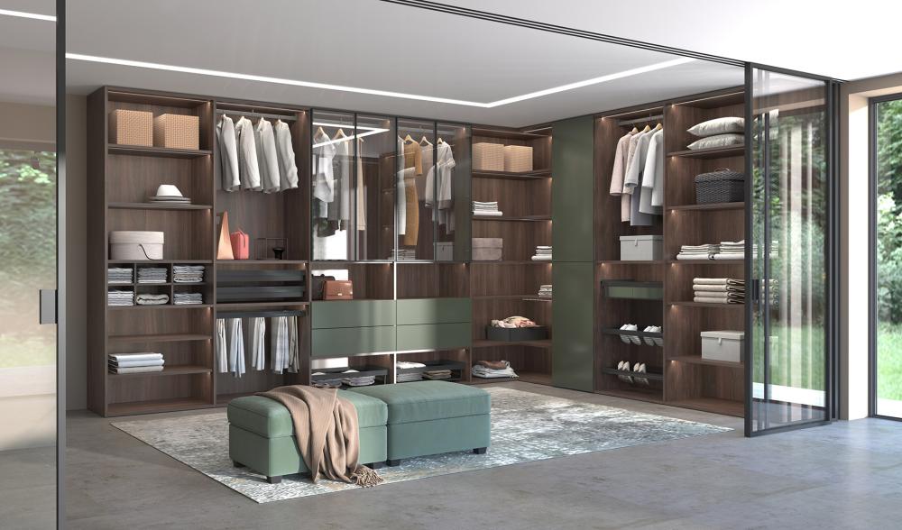 Визуальная строгость фасада модели «Прогма» придает образу гардеробной практичность и лаконичность. Эргономично продуманные системы хранения не только удобны в использовании, но и максимально эстетично дополняют образ гардеробной. Корпус выполнен из ЛДСП 25мм, в цвете Acacia Tartufo. Отделка фасадов: МДФ 22мм, покраска в цвет RIMI Eucalipto, gloss 5%. Витрины: алюминиевая рамка Elegance в черном цвете, стекло — Флоренс.