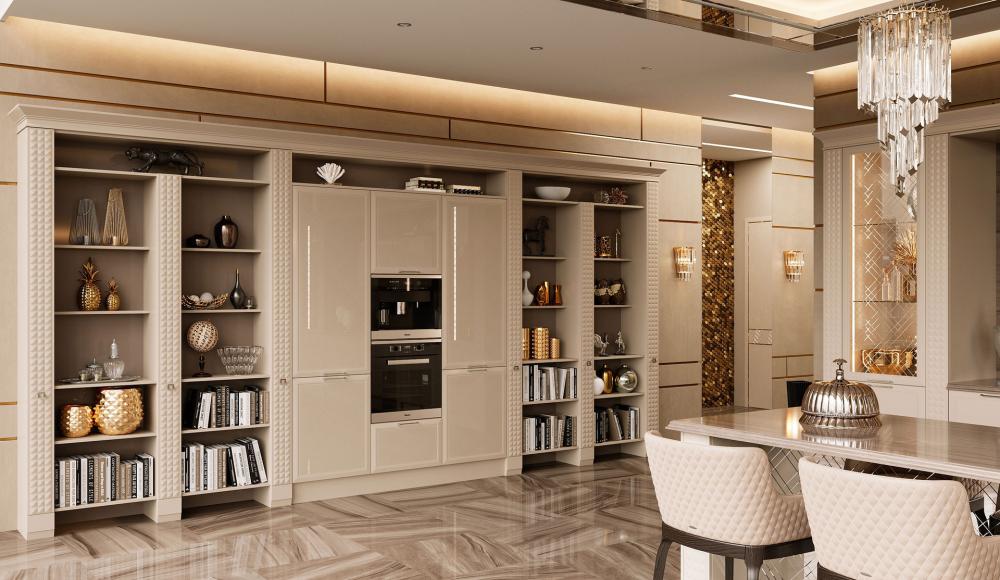 Великолепная мебель с фасадами «Ланже» переносит нас в Золотую эпоху Голливуда. Объединяя в своем эклектичном дизайне эстетику материалов и стильную геометрию, модель создает в помещении атмосферу роскоши и шика, но при этом не перегружает пространство. Роскошный внешний вид создается за счет сияния глянцевых фасадов, декорированных стеклом с фрезеровкой Ланже. А в роли стильного дополнения выступают декоративные пилястры с ромбообразным рисунком в стиле ар-деко.