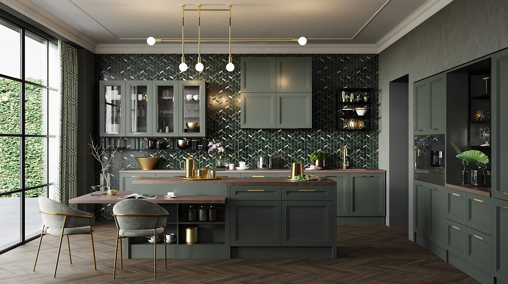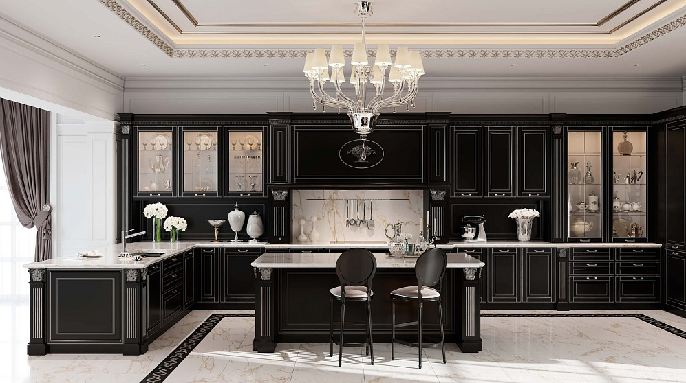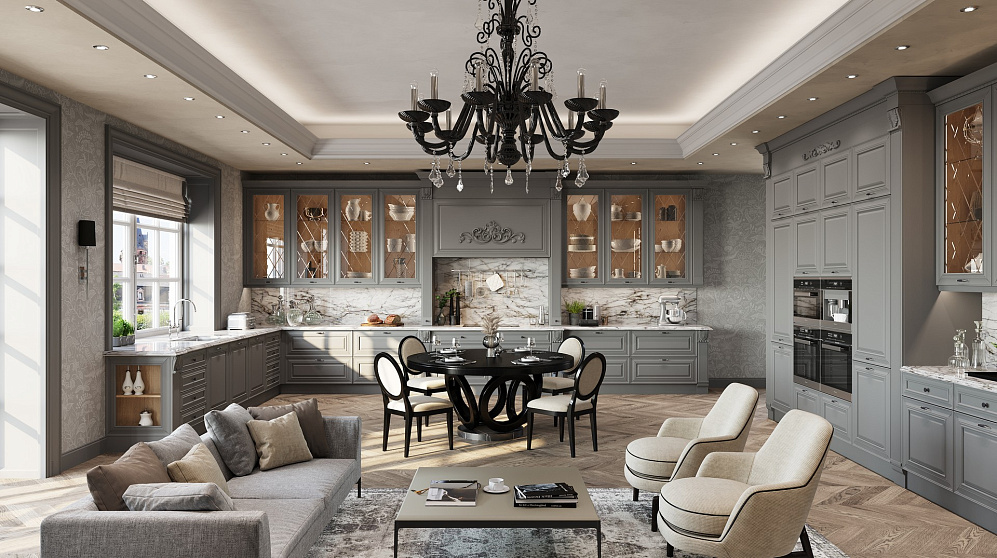 Эта модель, созданная в сотрудничестве с итальянскими дизайнерами – воплощение традиций английского стиля. Лицевые панели гарнитура выполнены из МДФ внушительной толщины – 24 мм, но, сложная фрезеровка придаёт им воздушный, невесомый вид. Главным акцентом становится пилястра с объемным современным декором. Карнизы с подкарнизником подчеркивают утонченного красоту итальянского дизайна. Модель «Монтичели», представленная в белом цвете, прекрасно подойдет ценителям английской классики. Акцентная каминная группа, буфет с витринами из стекла stopsol с гравировкой в виде ромба, остров, изящные объемные декоративные элементы – вместе создают неподвластный моде, элегантный и уютный интерьер дома. Фасадные элементы могут быть выполнены матовой или полуглянцевой эмали различных оттенков с возможным нанесением патины золотого, серебряного цветов.